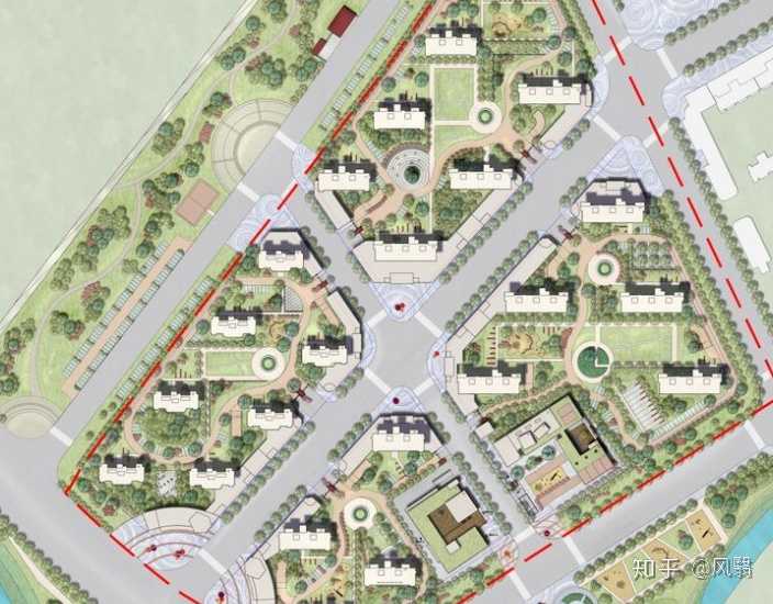 正因为有了这些批判理论,所以欧洲的城市设计就在不断的发展,罗西在《城市建筑学》里说过, 城市应该是历史性的而不是功能性的。 功能性是怎么样呢?依据日照、间距、流线、使用需求,简单直接地用色块、画线的方式,在二维平面上进行粗暴又隔离的功能分区,比如中国满大街都是这种【成熟的居住区】,因为来得快,效率高,但是这样作为图底关系中“底”的虚体——也就是构成城市活力的外部空间,就消极了起来。它失去了历史和文化(地域性),失去了边界,失去了场所精神,丢失了城市性(即城市的格局,影响因素有空间的光感、质感、色彩等等):