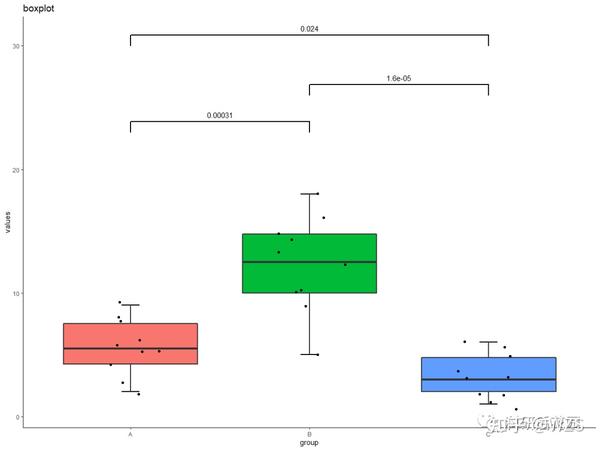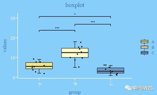 p <- p + geom_signif(comparisons = list(c("A","B"),c("A","C"),c("B","C")),#设置需要比较的组