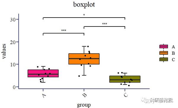 “ 在大家阅读文献的过程中,有时候会碰到下图所示的这种带有显著性标记的柱状图或者箱线图,这种图是怎么做出来的呢?今天,小编就使用R语言教大家如何绘制这样一张带有显著性标记的箱线图! ”