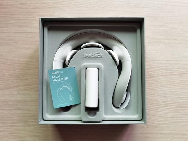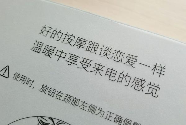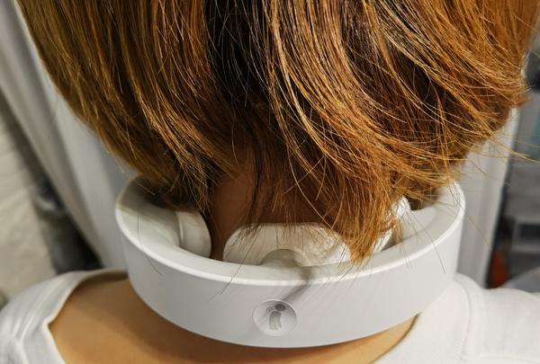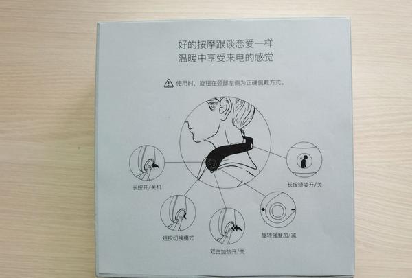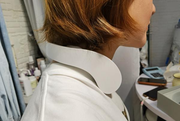 这款产品的主要功能一个是颈部按摩,一个是坐姿提醒。咱们先重点讲一下颈部按摩。把按摩器套脖子上以后,大概是这样的: