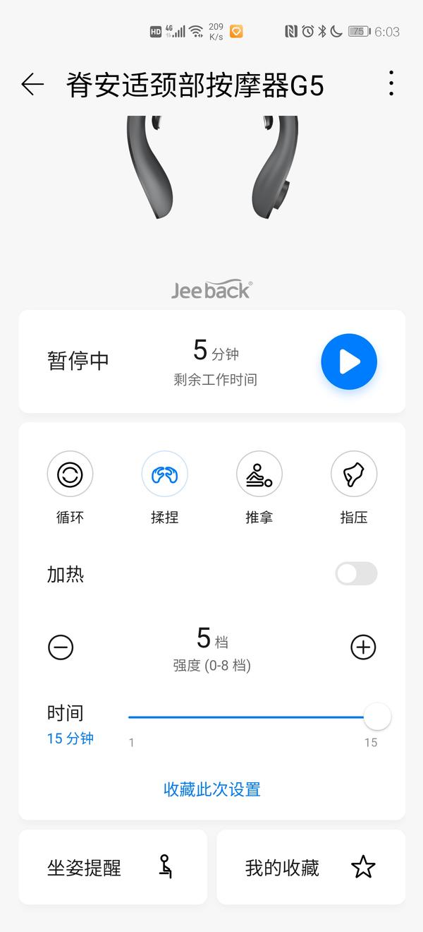 第一项,是按摩器的单次工作时长,默认设置是15分钟。期间你要是觉得够了,或者需要取下来做点其他的时期,可以随时按暂停退出。