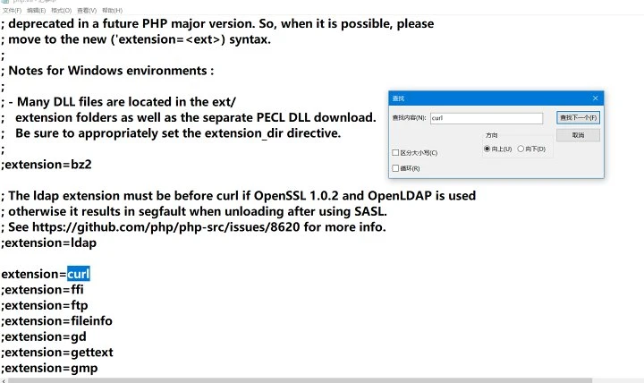 2.继续查找"extension=curl" 将这一行内容前面分号去掉
