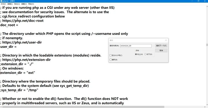 1.找到php.ini文件,选择记事本打开 左上角编辑 查找"extension_dir = "ext" " 将这一行内容前面的分号去掉