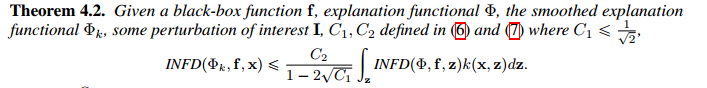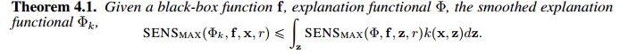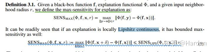 如果可解释性函数的局部满足Lipshitz continuous,我们可以得到最终的敏感性分数 SENS_{MAX}(\Phi,f,x,r) 表示