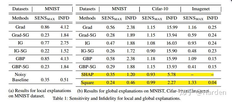 在MNIST, CIFAR-10和ImageNet上的评测对比多种可解释性方法,给出infidelity与sensitivity结果的对比