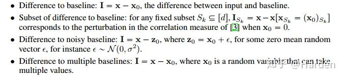 扰动 I 有多种定义形式,如下四种扰动:Difference to baseline, Subset of difference to baseline, Difference to noisy baseline, Difference to multiple baselines