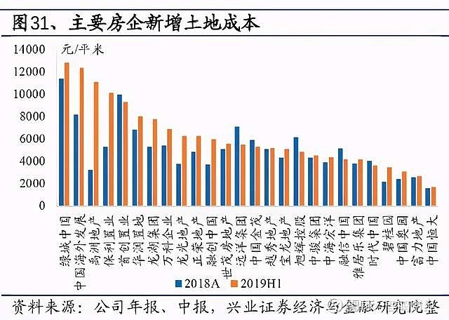 根据2019年各大房企半年报, 绿城中国 的土地成本已上涨至12000~14000元/m^2,而最低的成本也要2000元/m^2。