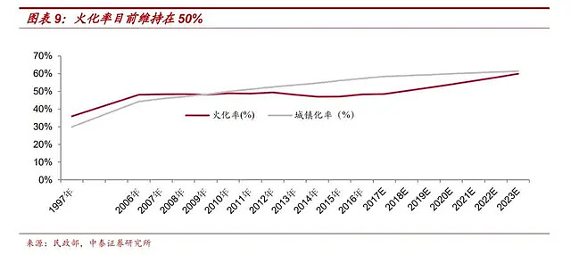 伴随城镇化的推进,城市用地愈发紧张,火葬能有效控制殡葬用地面积,火葬需求也逐渐提升,同时在政策层面也积极推动居民选择火葬。