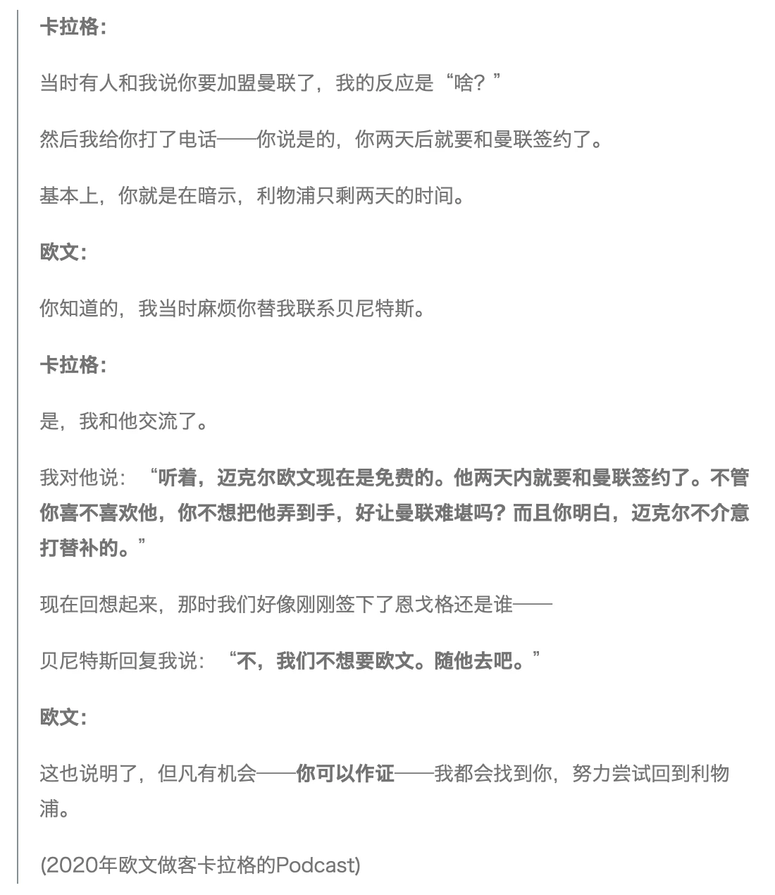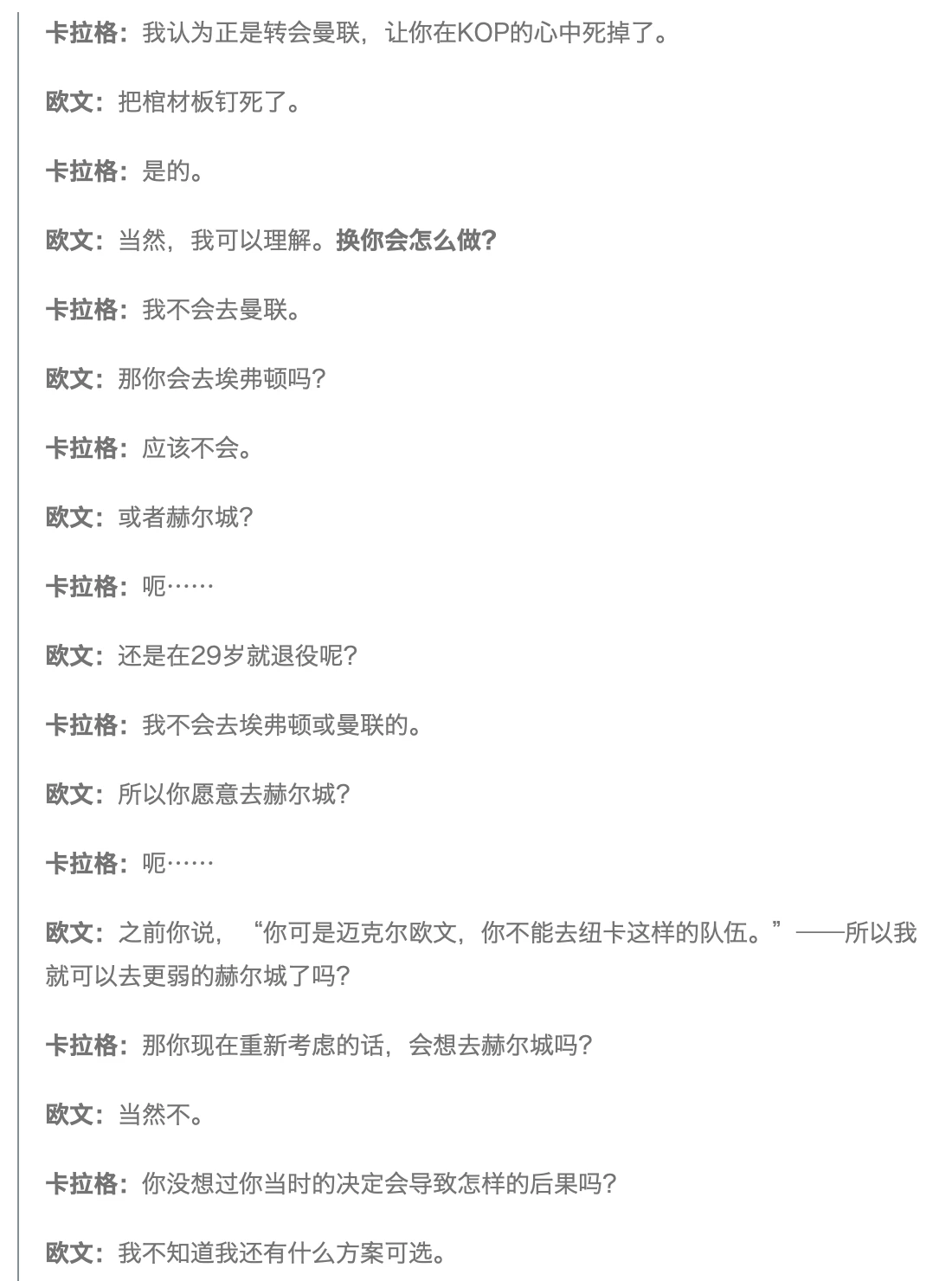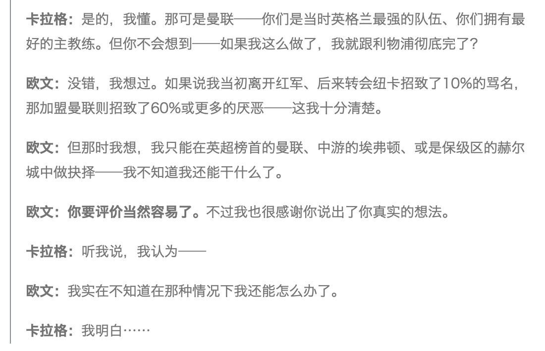 可见,就算作为欧文最好的朋友、就算对欧文当年转会曼联的细节知之甚多【卡拉格为欧文重回利物浦提供了许多帮助(详见下文他俩Podcast的另一段)】—— 当卡拉格被反问“换你会怎么做?去曼联、埃弗顿、赫尔城还是直接退役?”时,他依旧语塞了(“呃……”)