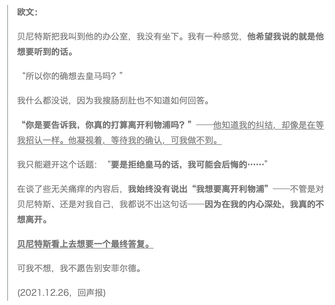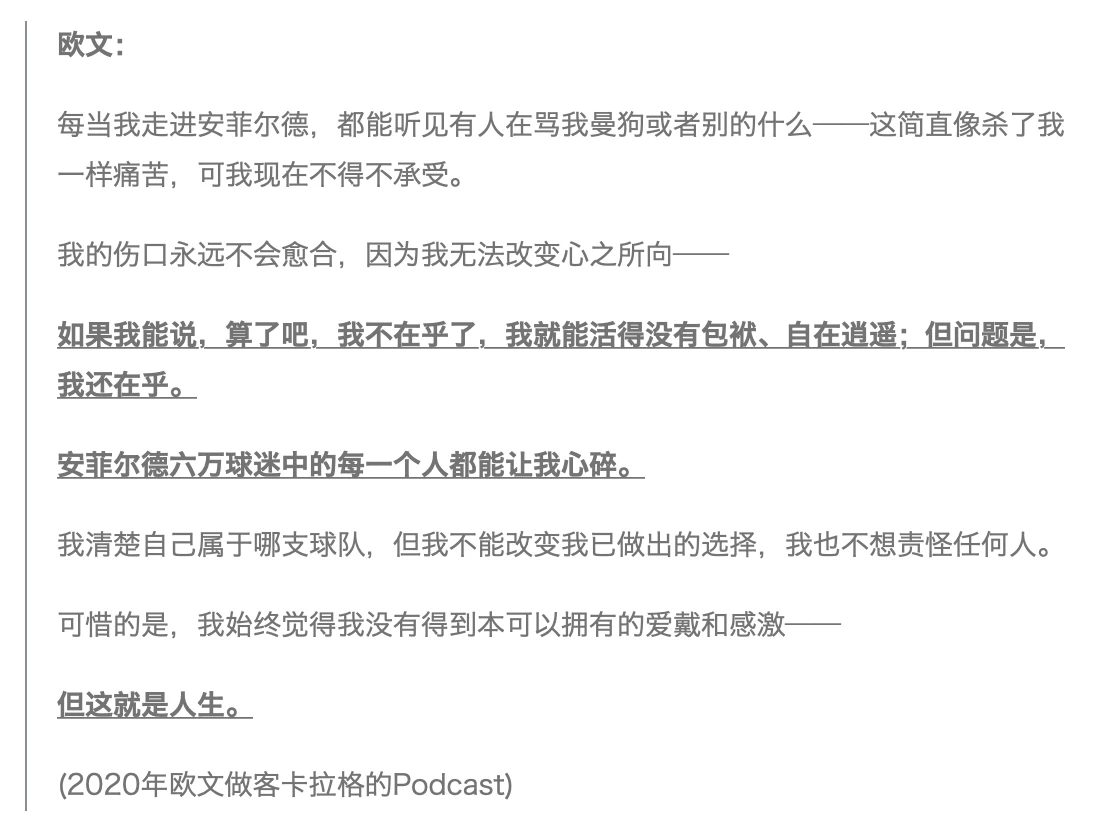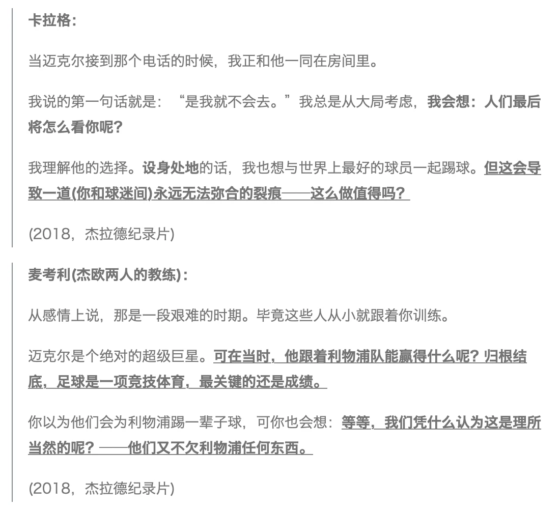想想吧,这居然是“又/红/又/专”的杰拉德会放在纪录片里的内容。没有一贯的“为利物浦踢球是一种荣耀”的队魂叙事画风,只有对欧文所做决定的体谅与理解、对“应当忠于俱乐部”的冷峻审视