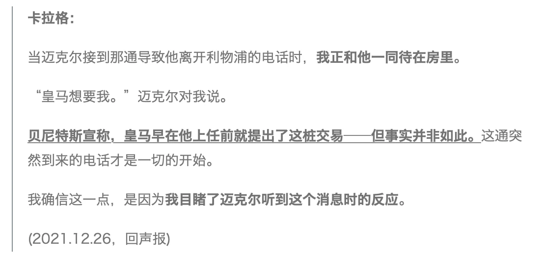 【注:贝尼特斯在他2012年的自传中提到,“ 当欧文结束他欧洲杯后的假期时,我把他叫到办公室来,询问他是否打算走人,他说是的。从那时起我唯一能做的,就是尽力为他的转会谈下更好的价格。 他的合同只剩一年,所以我们在谈判中没什么筹码可言。”但是,结合欧文的说法及卡拉格这个证人,我们知道:等到利物浦的新赛季都快要开始了(季前赛结束前夕),皇马才“浮出水面”;而在欧洲杯刚结束时,欧文根本没有转会的想法——可见, 贝尼特斯在说谎 】