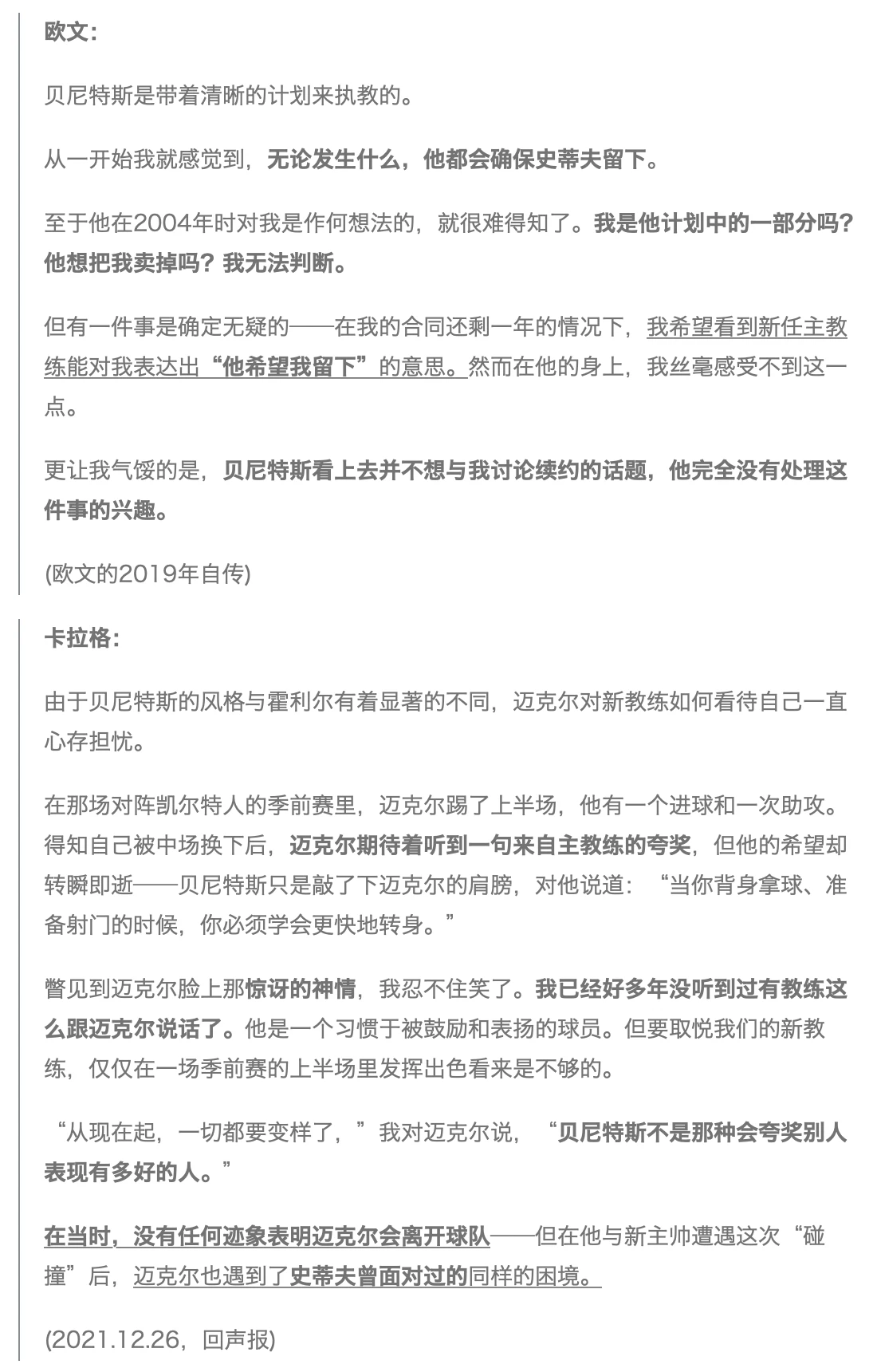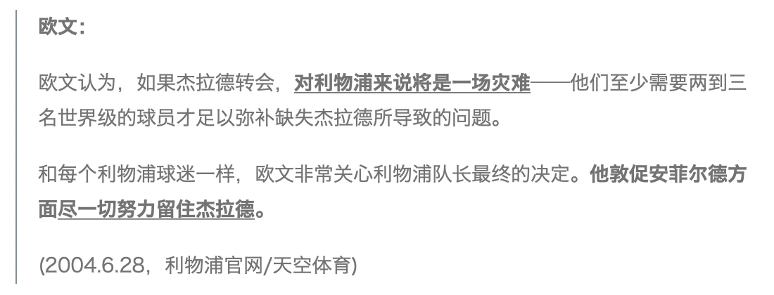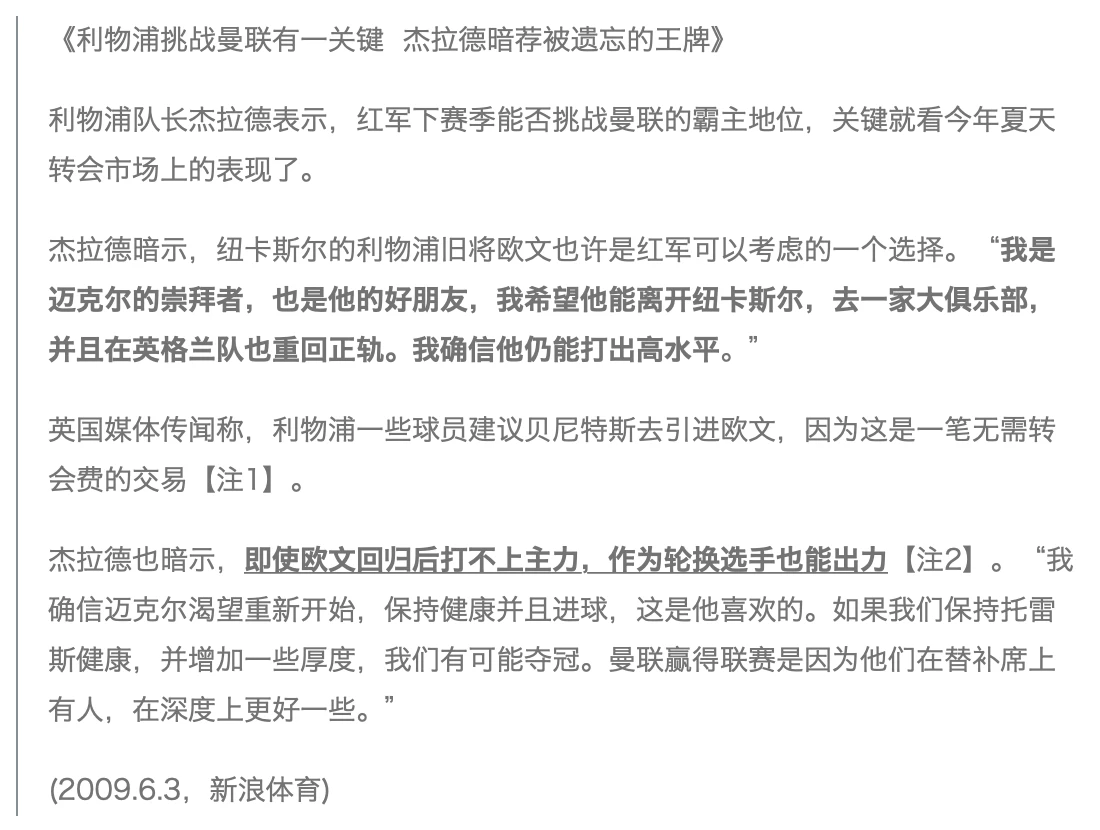 注2:显然,杰拉德的重点是“力荐”;但当年的部分欧文球迷却认为,他的最后一段话就是在揶揄欧文。然而事实上,杰拉德提到的“欧文可以做轮换队员”的说辞却是针对贝尼特斯的——