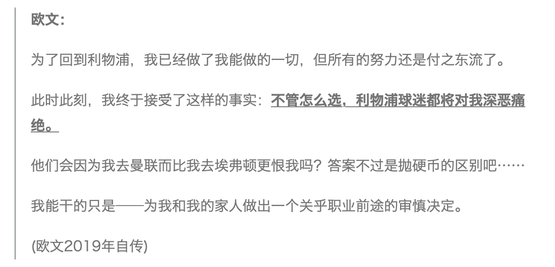 欧文曾不厌其烦地在各种媒介上反复解释三次转会中他所面临的种种无奈。而他写作2019年那本自传的目的之一,正是希望通过完整描述他的经历和感受,让人们知道他当年为返回利物浦所做的种种(未果的)努力