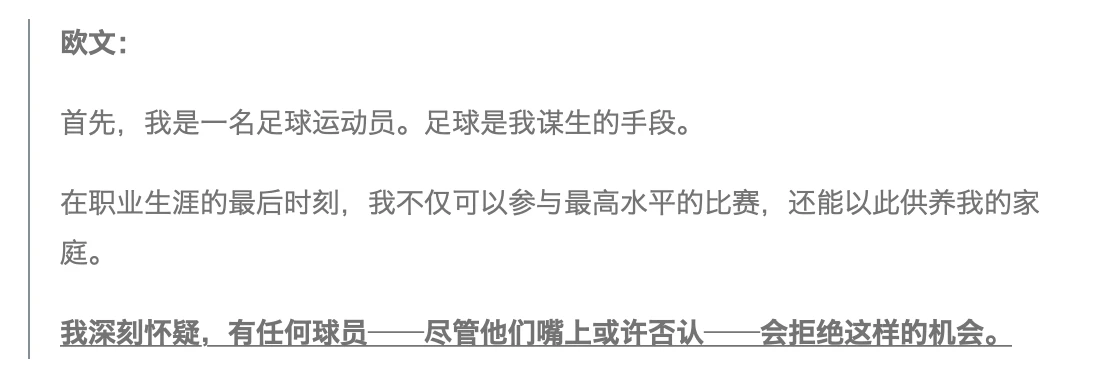 (3) 欧文的职业首先是足球运动员。一方面,他享受赛场,还不想退役;另一方面,踢球是他挣钱养家的方式,他要对自己的家人负责