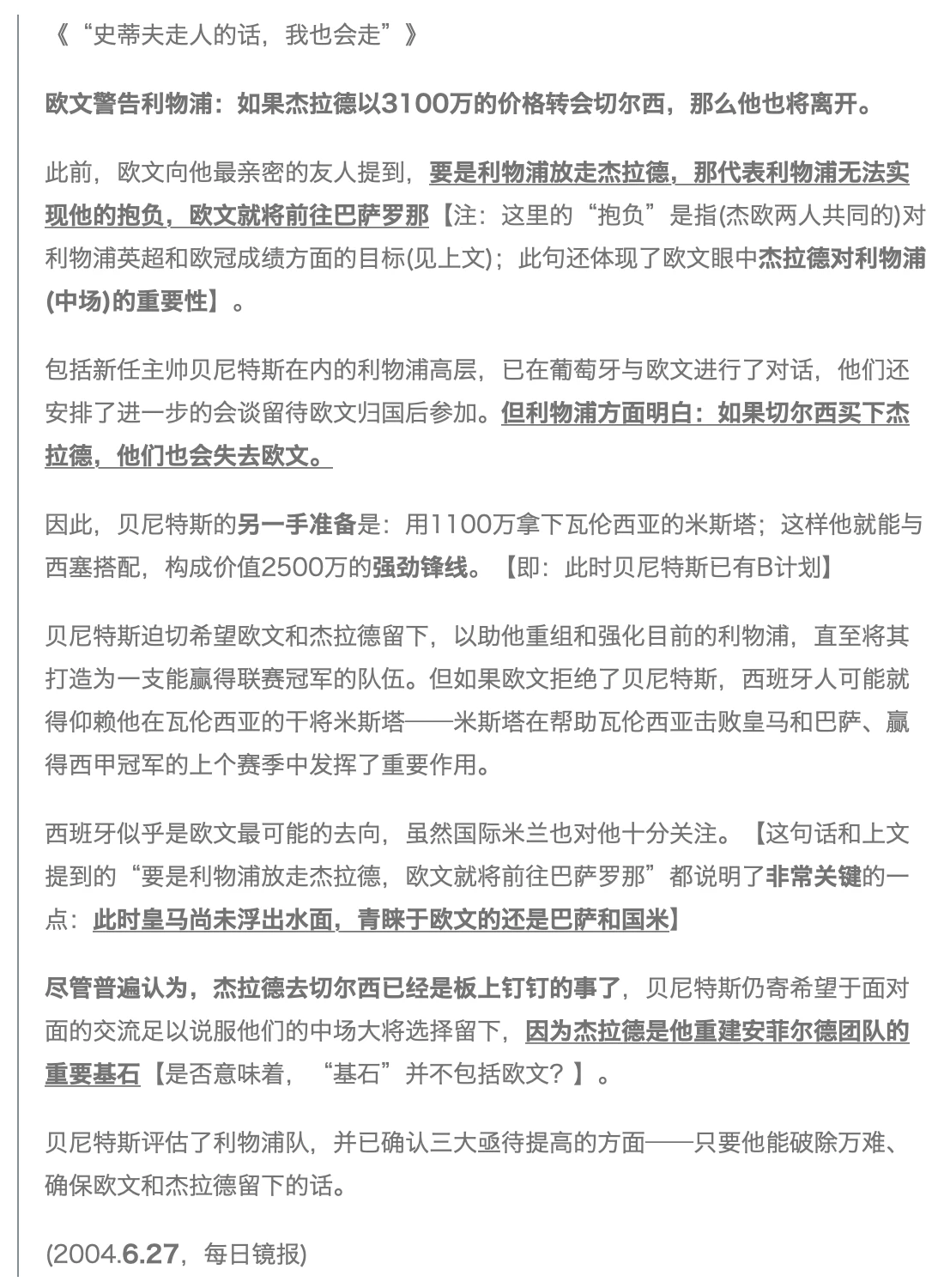 1. 刚从2004欧洲杯回来时,欧文更偏向于留在利物浦,杰拉德则有转会切尔西的传言
