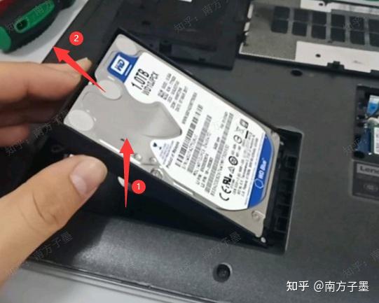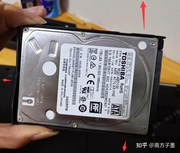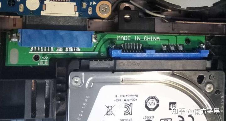 拆下4个螺丝,一手握着左边的黑色的这块转接卡,就可以取下硬盘了,不然还需要拆那条白白的硬盘数据排线。