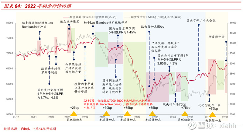 1)第一阶段:22年1月初-4月中旬,铜价整体呈现增长趋势。国内方面,1月,国内央行宣布下调1年期和5年期LPR分别至3.7%、4.6%,实行货币宽松政策;3月,山东某冶炼厂停产导致国内电解铜供给端受到扰动;4月初,由于疫情因素导致国内部分城市开始全城静态管理,下游开工受限与市场对需求的担忧使得铜价有所承压。海外方面,秘鲁社区扰动事件频繁发生,影响Las Bambas等铜矿产量,而俄乌冲突进一步加剧了市场对 大宗商品 供应链中断的担忧情绪,LME铜于3月初达到10,719.50美元/吨,达到2022年最高值;3月美联储加息25bp,正式进入加息缩表周期,使得铜价整体呈现振荡的趋势。