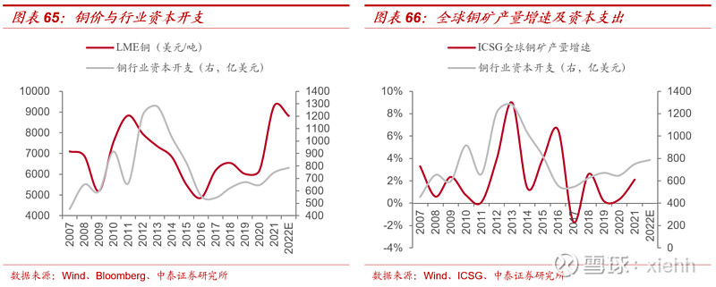 铜矿供给短中期逐步放量,长期产量增速将放缓。 从历史来看,铜行业资本开支与铜价处于正相关关系。而铜矿从最初可研到最终投产放量,平均需要约5年的时间。2010年,铜价上涨正向刺激了矿企对矿山的投入与建设,2015-2020年,铜价较低,矿企投入资本的动力下降,铜矿资本开支处于低位。考虑到全球疫情、社区事件带来的频繁罢工以及部分矿山品位下降的因素,部分铜矿被动放缓投产节奏,我们预计原定于2020-2021年放量的产量或将在2023年逐步释放。但长期来看,由于2015年以后行业资本开支处于低位,铜矿增速或将放缓,产量增量有限。