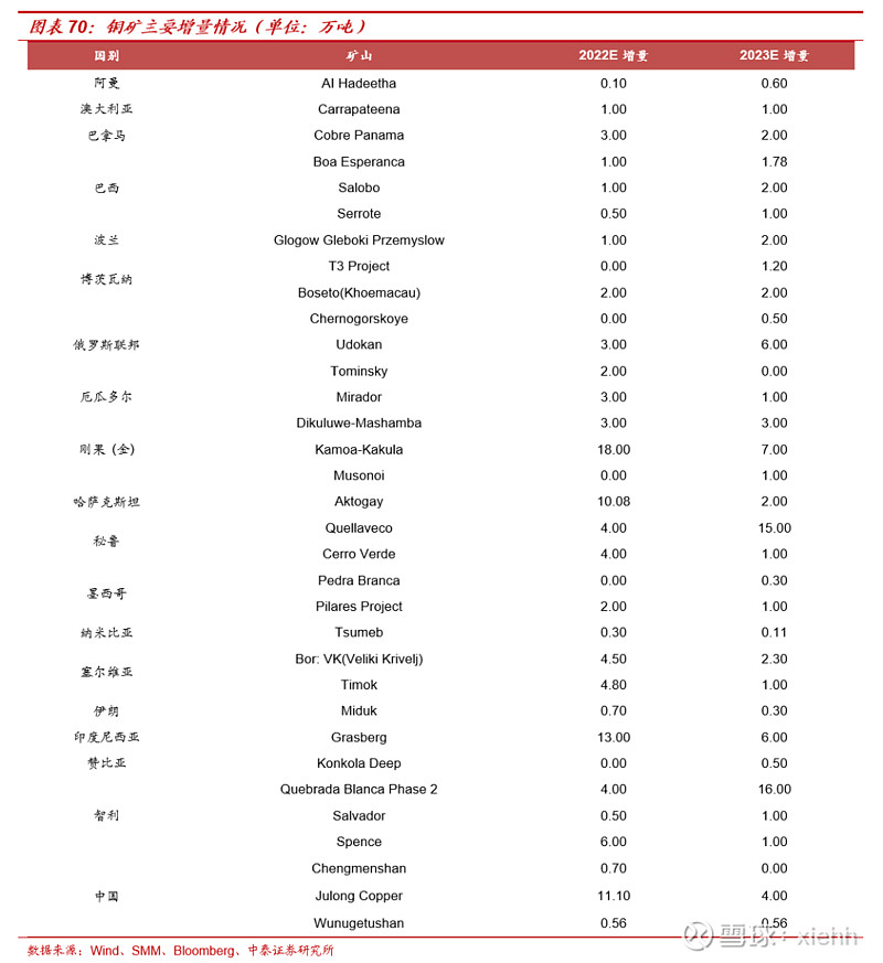 我们预计23年铜矿供给将明显回升。 考虑到2020-2021年,部分铜矿由于疫情导致投产不及预期,2022年由于智利铜矿品位下降,以及秘鲁铜矿受到罢工等事件影响,预计2022年全球铜精矿产量1872万吨,同比增4.1%,假设2023年社区罢工等事件的影响削弱,预计全球铜精矿产量或将增长130万吨以上至2005万吨,同比增7.1%。