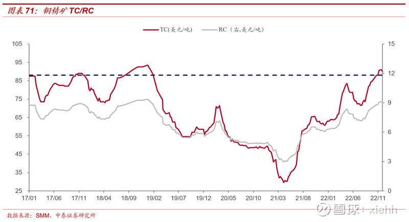 TC/RC反映23-24年铜精矿供应相对充裕,也将进一步走高。 截至12月2日,铜精矿TC达到90.06美元/吨, 江西铜业 、中国铜业、 铜陵有色 和金川集团与Freeport敲定2023年铜精矿长单加工费Benchmark为88美元/吨与8.8美分/磅,创2017年以来新高,2023年度的进口铜精矿长单加工费Benchmark较2022年的增加23美元/吨,交易双方对铜精矿的供需平衡预期较为一致,即2023年铜精矿供应相对充裕。