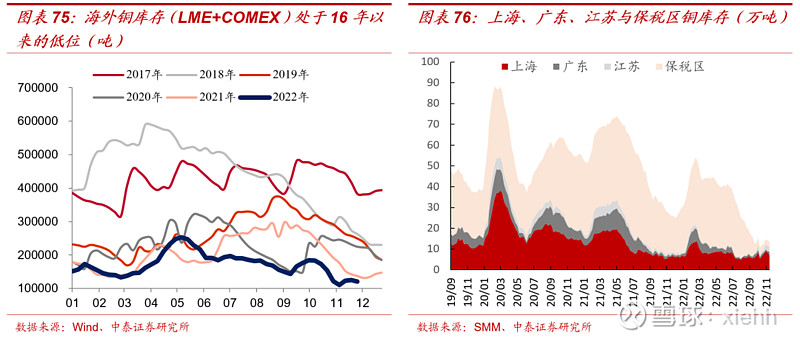 2022年年初至今,全球库存不断走低,并创出历史新低。截至12月2日,LME与COMEX铜库存为12.06万吨,处于2016年以来的低位。国内库存方面,截至12月2日,上海、广东、江苏三地总库存10.84万吨,三省社会库存同比增加36.52%;保税区库存2.84万吨,保税区库存同比减少84.52%。国内铜库存亦处于历史底部。