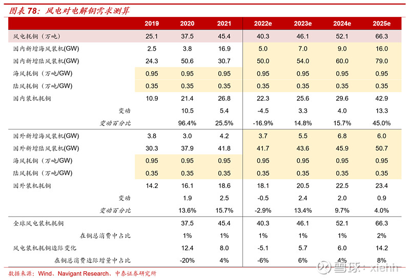1)根据Navigant Research数据,单位GW海风和陆风装机耗铜分别为0.95万吨和0.35万吨。根据我们的测算,预计2023-2024年全球风电装机耗铜量分别为46.1万吨、52.1万吨。2023-2024年年全球风电装机耗铜量占铜总消费中的1%/1%,在铜消费边际增量中占比为6%/4%。