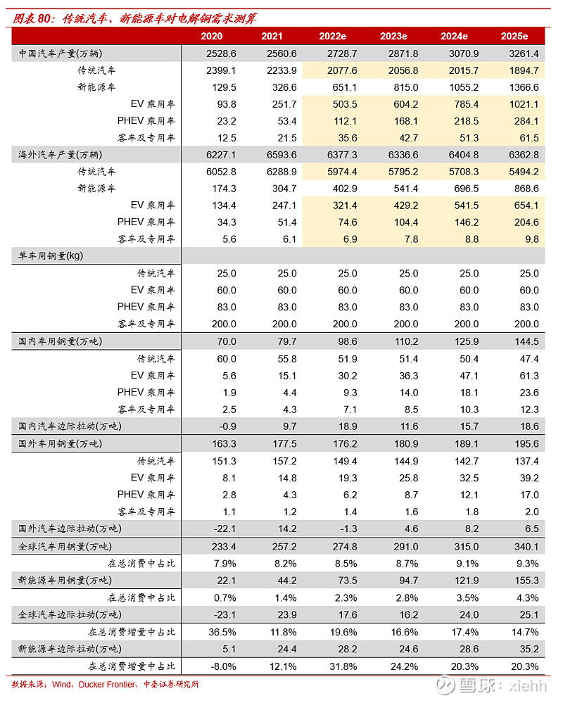 新能源车 也将继续拉动全球用铜需求。 根据Ducker Frontier,我们假设传统汽车、EV乘用车、PHEV乘用车与客车及专用车的单车用铜量分别为25.0、60.0、83.0、200.0千克,预计2023-2024年全球汽车对电解铜的需求量约为291.0万吨/315.0万吨,其中新能源车需求量94.7万吨/121.9万吨。
