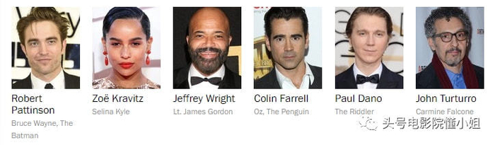 影片主演阵容非常强大,除了罗伯特扮演的蝙蝠侠,保罗·达诺(《血色将至》《为奴十二年》)出演谜语人,佐伊·克罗维兹(《疯狂的麦克斯:狂暴之路》)出演猫女,科林·法瑞尔(《神奇动物在哪里》)出演企鹅人,安迪·瑟金斯(《指环王》咕噜)出演管家阿尔弗雷德,杰弗里·怀特(《西部世界》)饰演戈登探长。