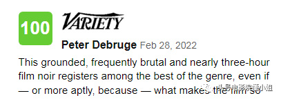 《新蝙蝠侠》这些黑暗和转变的元素,在打出100分的影评人彼得·德布鲁的文章里,一一体现,好评几乎要满溢出来:他不仅提到诺兰的《黑暗骑士》,还提到了前不久两部成功的商业片《007:无暇赴死》和《沙丘》,与之相提并论——