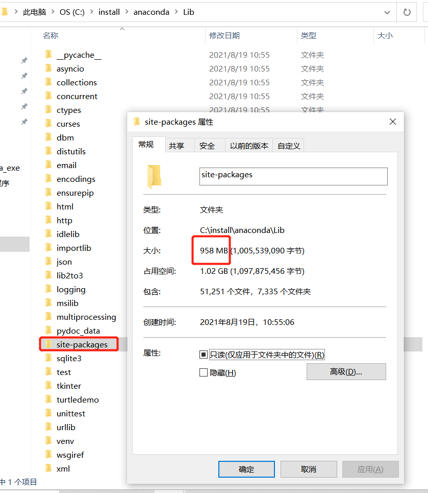 原因分析: Pycharm中创建的虚拟环境所包含的库太大,一些用不着的库也都包含在里面了。见图虚拟环境路径,C:\install\anaconda\python.exe,找到对应包的位置:C:\install\anaconda\Lib\site-packages,见下图。发现足足有1G大小。