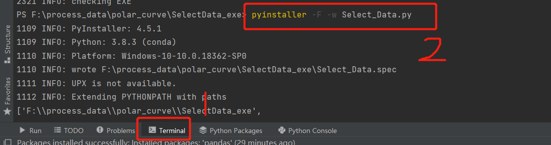 在Terminal框中编辑 pyinstaller -F -w Select_Data.py