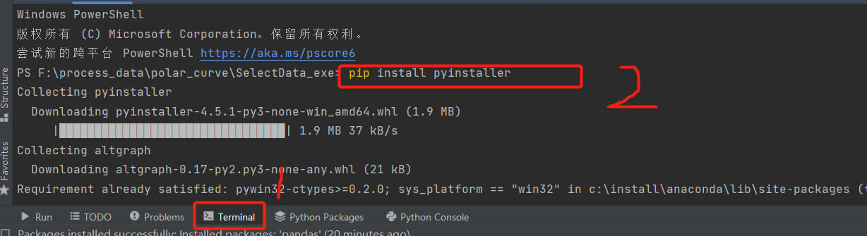 方法②:打开Pycharm ,点击Terminal终端,而后在编辑栏输入pip install pyinstaller即可安装。
