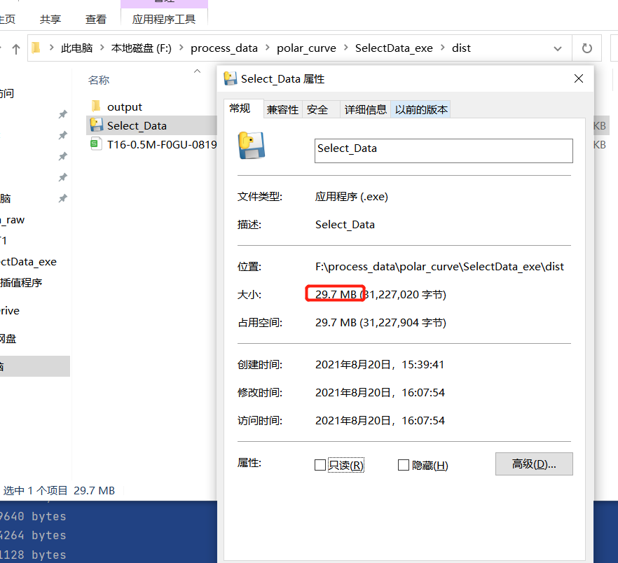 而后在Pycharm 的Terminal终端继续输入pyinstaller -F -w Select_Data.py,最终得到的exe只有29M,减小了10倍。