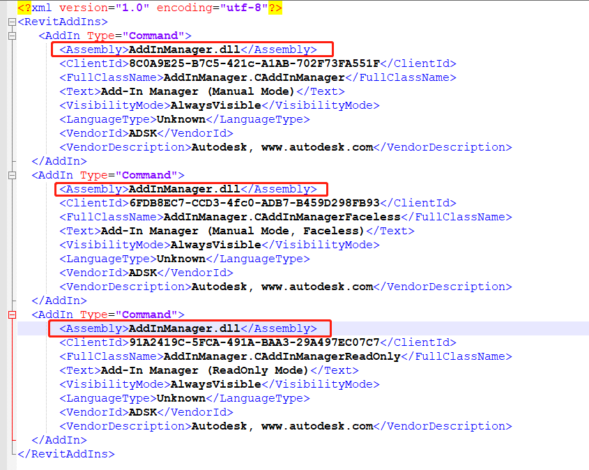 以txt格式打开文件Autodesk.AddinManager.addin,修改Assembly的dlll路径,将Autodesk.AddInManager.addin文件中所有的[TARGETDIR]用实际路径替换,或者删除字符串“[TARGETDIR]”