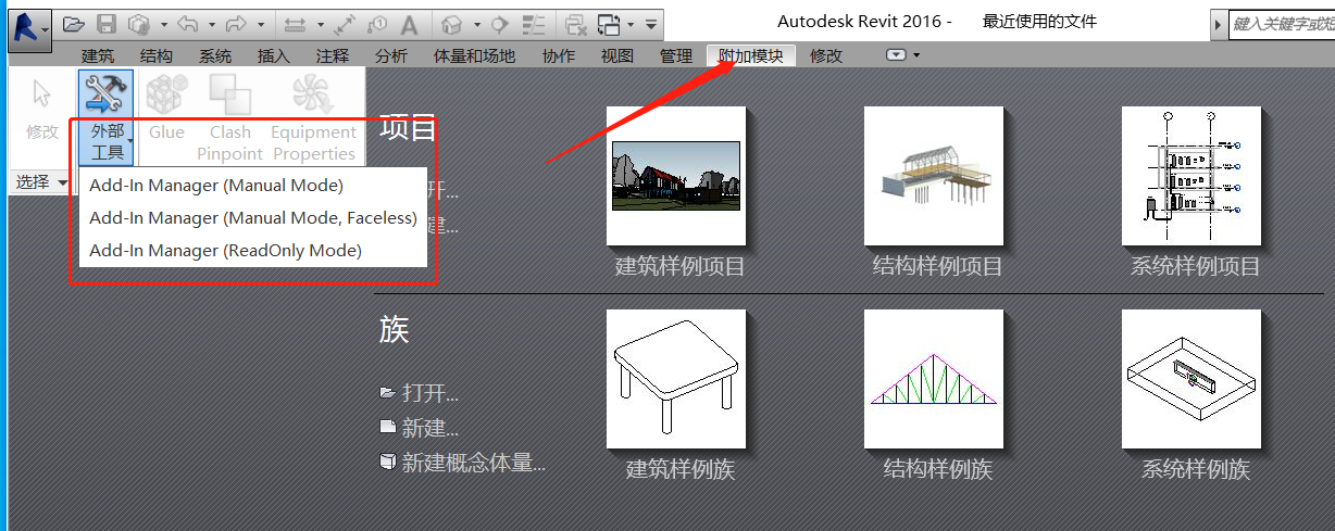 然后重新启动Revit,可在菜单栏的【附加模块】/【外部工具】看到加载的addin