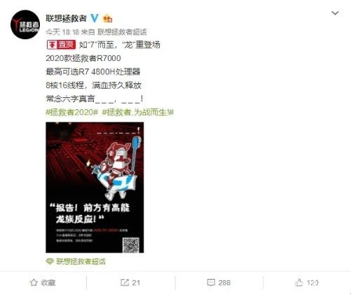 据悉,联想在国内市场也会上市该款机型,大概会在五月份与大家见面,并将命名为联想拯救者R7000系列。早些时候联想在微博预告了2020款拯救者将搭载锐龙4800H处理器的消息,最终的配置是否会缩水还不得而知。如果在售价方面与海外市场差不多,在7000多元左右的话,大家会购买吗?