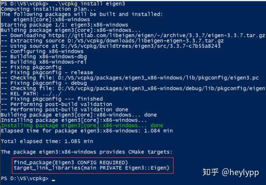 注:可以用 eigen:x86-windows或eigen:x64-windows指定安装的版本,可以使用的版本还包括