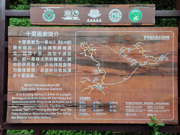 进入景区乘坐环保车到十里画廊站,不管是山上还是山下停车场,都有工作人员指引疏导,无论去天子山索道下站、十里画廊、水绕四门,百龙天梯下站,还是三岔口站,只要听清工作人员报的站名及环保车编号,然后按照编号乘车就好。水绕四门和百龙天梯下站是乘同一趟车,而且两站间距离并不远。环保车路线是标志门门票站—十里画廊站—水绕四门站(又叫金鞭溪站,此站可以转车到梓木岗门票站)—百龙天梯下站(搭乘百龙天梯上山,前往森林公园袁家界)。大概15分钟到达十里画廊站,乘坐小火车进入,步行出来,十里画廊号称10里,实际4-5里地,全部为栈道,都是平路不费力,步行往返估计约1.5小时,天气好没必要乘小火车。继续乘坐环保车到水绕四门站,准备徒步金鞭溪,在十里画廊下的是小雨,进入金鞭溪时雨是越下越大,而且有点漂泊大雨的意思,只能原路返回到水绕四门,在德克基休息等雨停,等了半天雨没有停的意思,干脆原路返回到森林公园标志门,雨下的太大,直接打车回酒店。