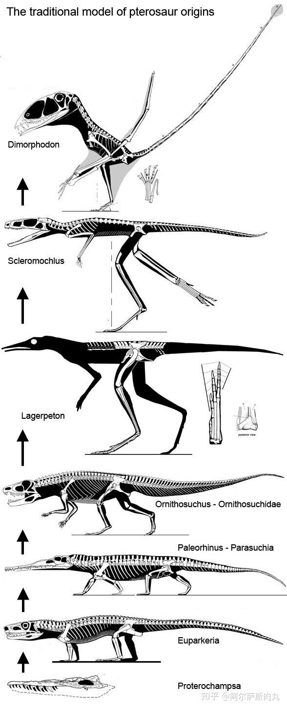 “翼龙应该是从介于斯克列罗龙与兔鳄之间的物种演化而来的”假说,也是基于同样的理论。