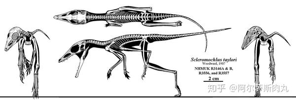 这群体长约在18公分、生存于现今苏格兰、善于四足/两足直立步态运动的小型动物,名叫: 斯克列罗龙(Scleromochlus) , 属于最早的鸟颈类主龙之一。而它们,极有可能是翼龙这个庞大家族的祖先之一。