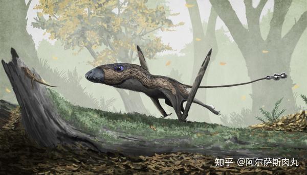 首先,假设沙洛维龙真的是翼龙的祖先,那么它们应该具有相同的祖征,也就是连接前肢与身体的翼膜。然而目前发现的所有化石证据都显示,这群小巧灵敏的二足动物有着与翼龙截然不同的翼膜构造:它们的“翅膀”是由延长的后腿骨连接尾部肌肉形成,这显然与翼龙相悖,推测这样的结构利于沙洛维龙在树枝间跳跃、滑翔以躲避天敌和捕食。