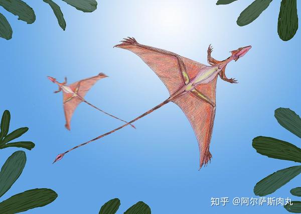 这一点在翼龙的两大类群上更是体现的淋漓尽致:早期的喙嘴龙亚目飞行能力并不佳,其中很重要的一个原因就是它们那条长长的尾巴,这严重影响了飞行的速度和稳定性。而进化到后期的翼手龙亚目,尾椎骨此时已缩短到几乎消失的地步。随之而来的是飞行能力的迅速改善,而飞行能力的大为提升也让翼龙占据的生态位越来越广泛:中小型翼龙统治着森林、灌木、树梢、河流滩涂等领域并同鸟类展开激烈角逐;大型翼龙凭借体型优势则成为高空绝对优势霸主。
