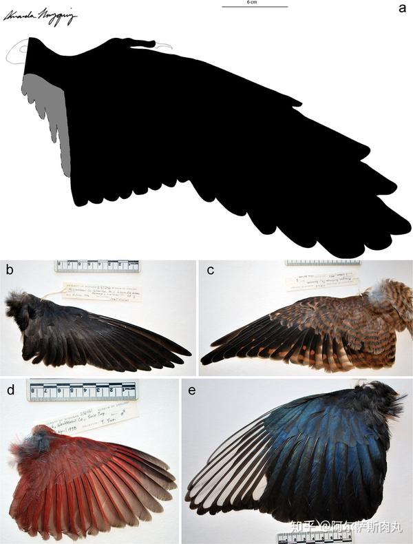 与翼龙和蝙蝠依靠指骨延伸支撑形成的皮膜不同,鸟类的翅膀是由合并的三根指骨附着肌肉和羽毛而成,且羽毛有着非常特殊的结构:即每一根羽毛都是由两侧平行伸展出的羽枝组成,羽毛顶端的羽小枝呈钩状结构,称之为“带钩羽小枝”,而羽枝的另一侧则具有边缘卷曲的片状结构,称之为“滑道羽小枝”,这样“钩+滑槽”的结构使得羽毛即使掉落也能再次补充生长,具有非常强的自我修复能力和延展性。