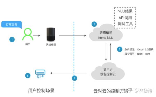 所谓云对云,就是智能音箱听到一个控制指令,比如:打开空调.这条指令会传给智能音箱的云端,云端会根据"打开空调".去找到加入的空调,然后根据空调的品牌,找到对应品牌商的云端控制地址,把指令发给品牌商,品牌商收到指令后,再下发指令给自己的空调,从而控制空调打开.