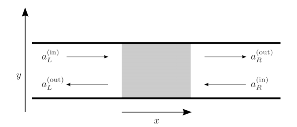 我们可以先将讨论放在前文画出BHZ模型能带时候的情况下:一个方向具有周期性(/无穷大)边界条件、,一个方向为有限(设为N个格点),那么,这个系统的讨论可以视作一维的,那么态可以写作 | \psi \rangle = \sum_{l=1}^N a_l | l,\pm \rangle_c , \pm 标识内禀自由度,通常情况下即自旋自由度, c 意味着态是Current-normalized( |l,\pm\rangle_c=\frac{1}{\sqrt{|v_{l,\pm}|}}|l,\pm\rangle; v_{l,\pm}=\frac{dE(k)}{dk}| _{k=k_{l,\pm}} )的,可看作整个散射过程只散射一个电子。由于我们要考虑杂质的散射过程,我们需要通过L,R来标识杂质两边的态,in/out标识入射和出射态。以N个 |l,\pm\rangle_c 态为基,我们有:
