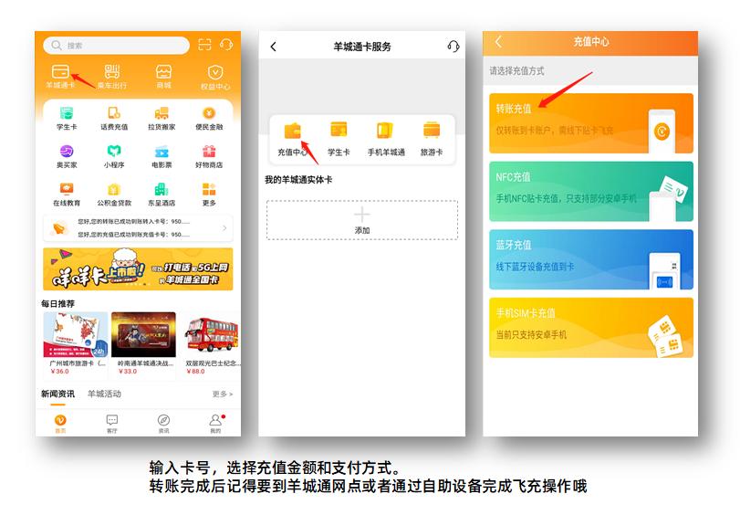 没有NFC手机?没关系!目前大家可通过羊城通微信公众号、羊城通APP、支付宝的充值模块进行转账充值操作。