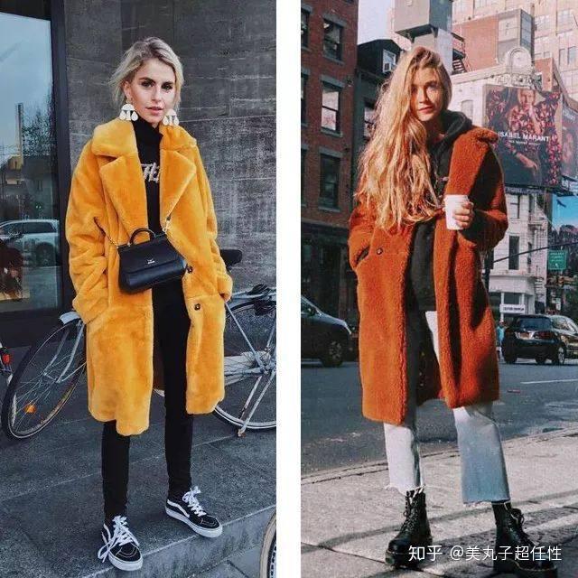 更加大胆的街拍达人选择的是明黄色泰迪熊外套,搭配全黑的内搭,配上vans,时尚又不是帅气,为了避免穿出臃肿的感觉,浅色系的泰迪熊外套一定要搭配深色系的内搭,这样才有强烈的对比,突出层次感。不会显胖。但是丸子不建议选择粉色,绿色,紫色等颜色的泰迪熊外套,不仅难搭配,毛看起来不高级,而且很没有质感。