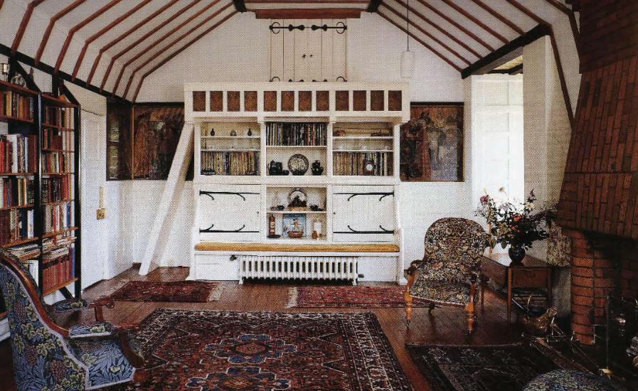 长凳、橡木条等细部带有哥特风格,衣柜、碗橱和立柜则绘满了彩漆画,莫里斯还教会了妻子刺绣,主卧墙上的绣花挂毯就是妻子的作品。