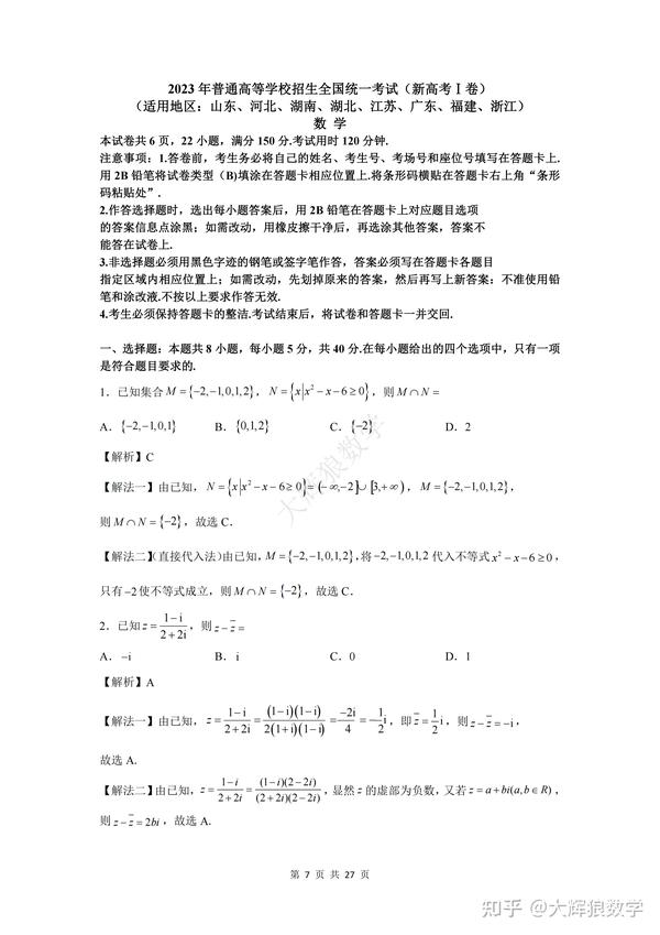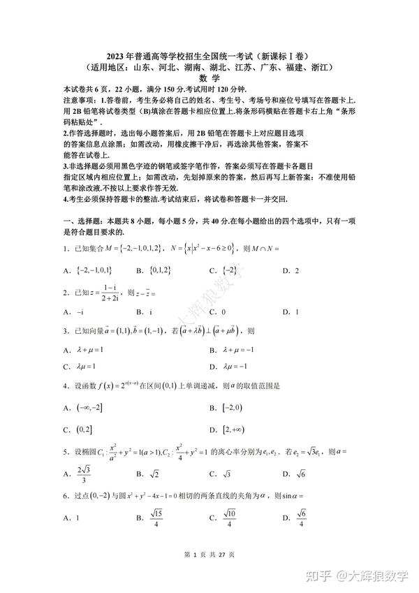 以下为2023年全国新高考一卷数学试题真题及答案解析(如需相应文档请搜索同名公众号请联系作者):