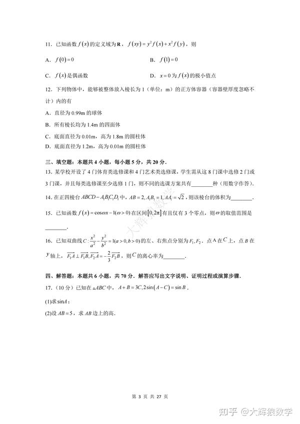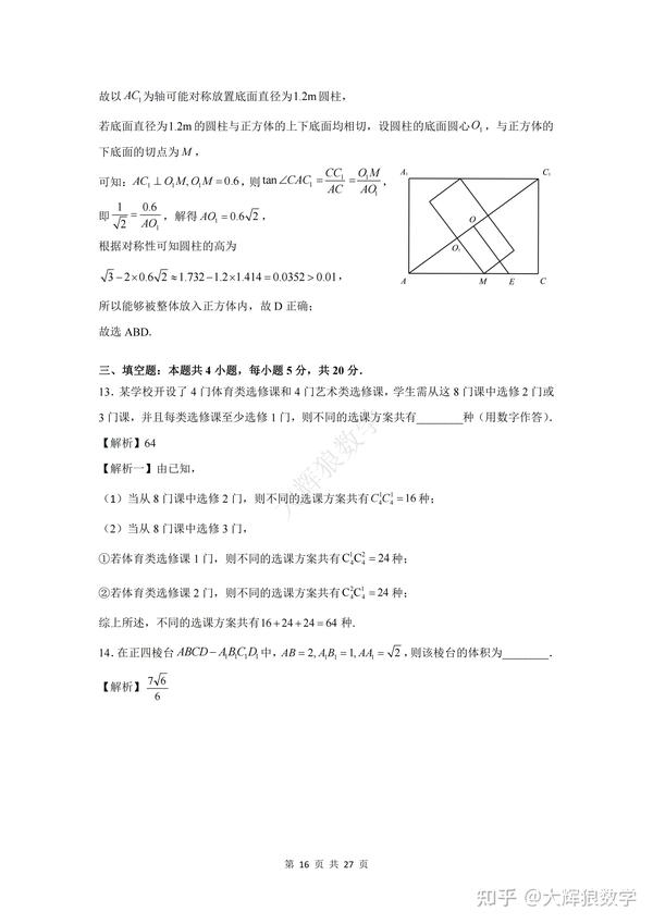 填空题部分,第13题考查了排列组合当中的“选课”相关问题;第14题考查了棱台的体积相关问题;第15题考查了函数的零点相关问题;第16题考查了圆锥曲线中双曲线的离心率相关问题。